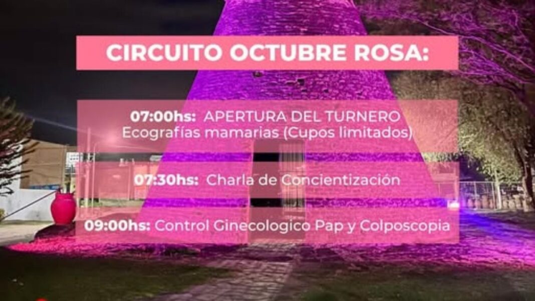 Bialet Massé. En el marco del mes de sensibilización sobre el cáncer de mama, la Municipalidad de Bialet Massé puso en marcha el “Circuito Octubre Rosa”, una iniciativa destinada a promover la prevención y detección temprana de esta enfermedad. Las actividades se desarrollarán los días viernes 3, 17, 24 y 31, y el martes 21 de octubre, en el Centro de Atención Primaria de la Salud (CAPS) ubicado en la esquina de Del Viso y Rivera Indarte.