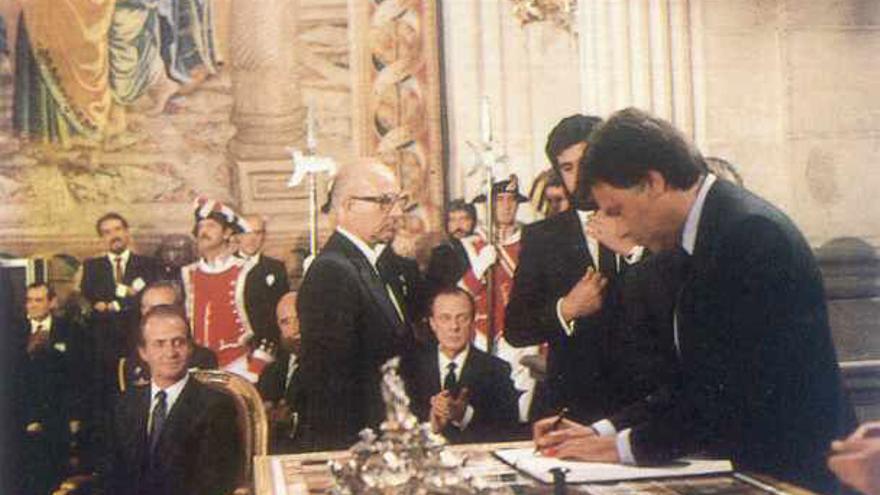 Hace hoy justo 40 años, en el Salón de Columnas del Palacio Real, el entonces presidente del Gobierno de España, Felipe González, firmó el Tratado de Adhesión a la Comunidad Económica Europea (CEE). España entró el 12 de junio de 1985, junto con Portugal, a formar parte del proyecto europeo, que pasaba de 10 a 12 miembros. Cerca de González se encontraba el presidente del Consejo Europeo de jefes de Estado y de Gobierno de la CEE, el italiano Bettino Craxi.