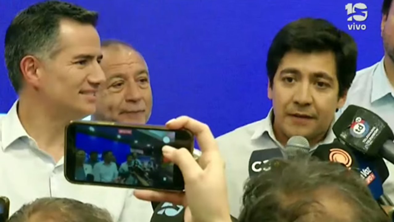 El abogado laboralista y empresario estacionero de 46 años dio una conferencia de prensa junto a su socio y jefe de campaña, Gabriel Bornoroni, ambos de camisa blanca. A sus espaldas, de remera negra, los acompañó el senador Luis Juez.