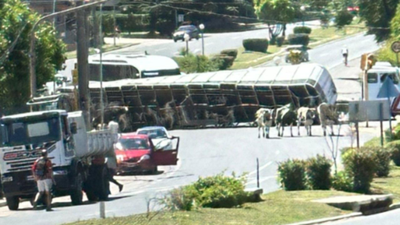 Un camión jaula que trasladaba ganado se dio vuelta este lunes en la Ruta 38 a la altura de Villa Giardino