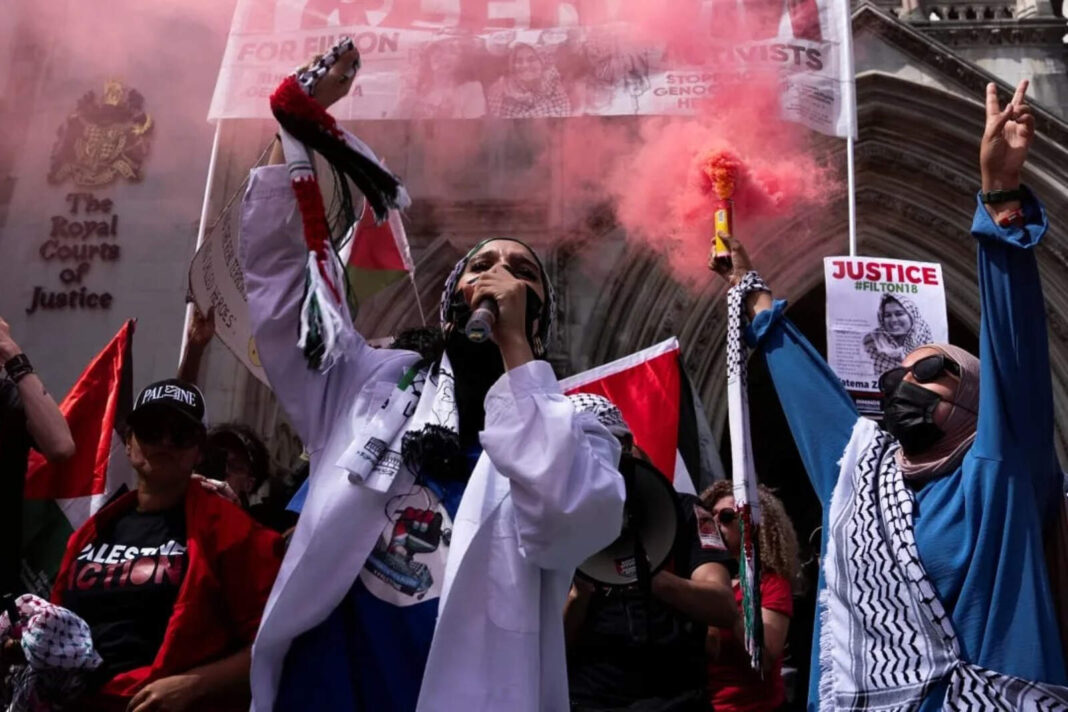 En julio, el Parlamento británico incluyó a Palestine Action en la lista de organizaciones proscritas después de que algunos de sus miembros irrumpieran en una base de la Real Fuerza Aérea (RAF) y dañaran aviones en protesta por el respaldo del Reino Unido a Israel.