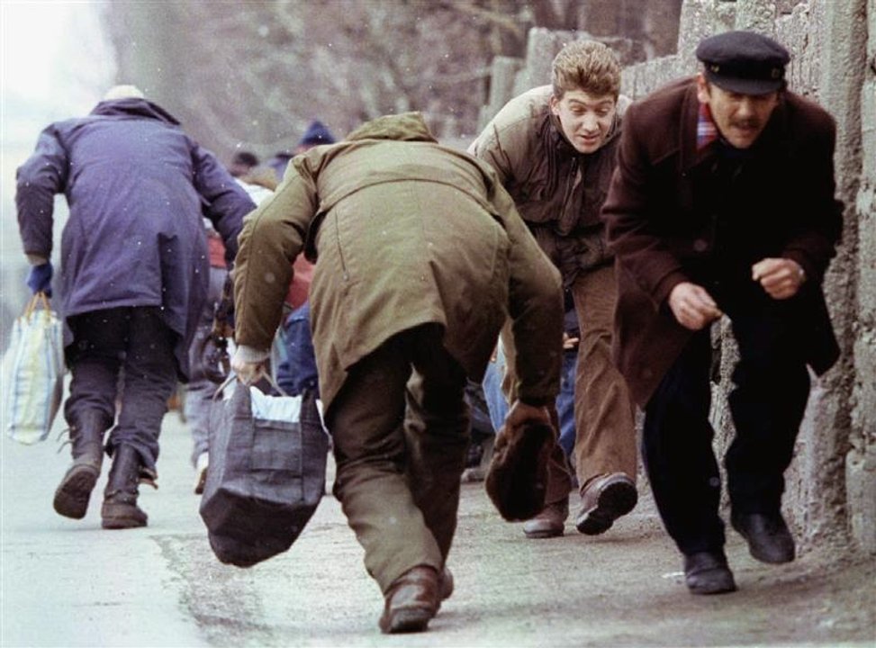Un francotirador croata bosnio apunta cuidadosamente a un grupo de civiles musulmanes bosnios que hacen compras en un mercado al aire libre el 17 de agosto de 1993 en Sarajevo, Bosnia. Crédito: Northfoto / Shutterstock.com.