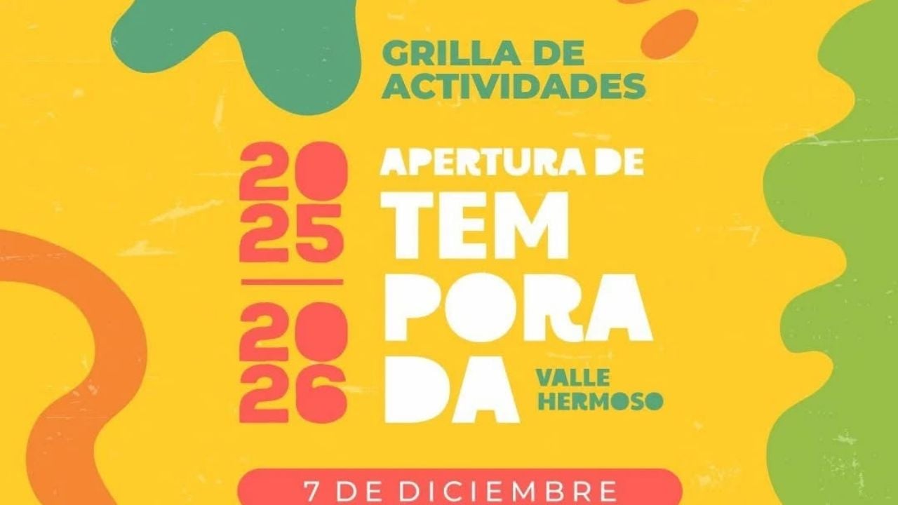 Valle Hermoso. La Municipalidad de Valle Hermoso presentó la grilla oficial de actividades para la Apertura de Temporada 2025/2026, que se llevará a cabo el 7 de diciembre en la Plaza General Manuel Belgrano, con entrada libre y gratuita. El evento promete una jornada cargada de música, deporte, gastronomía y espectáculos para toda la familia.